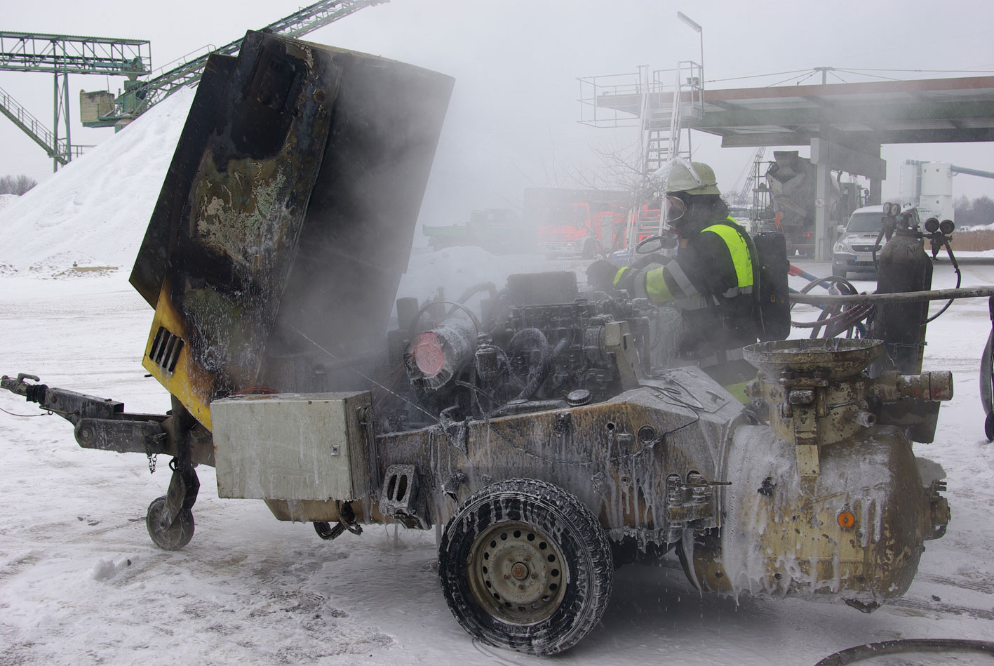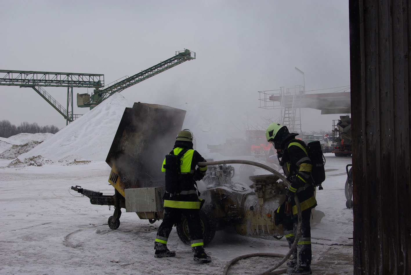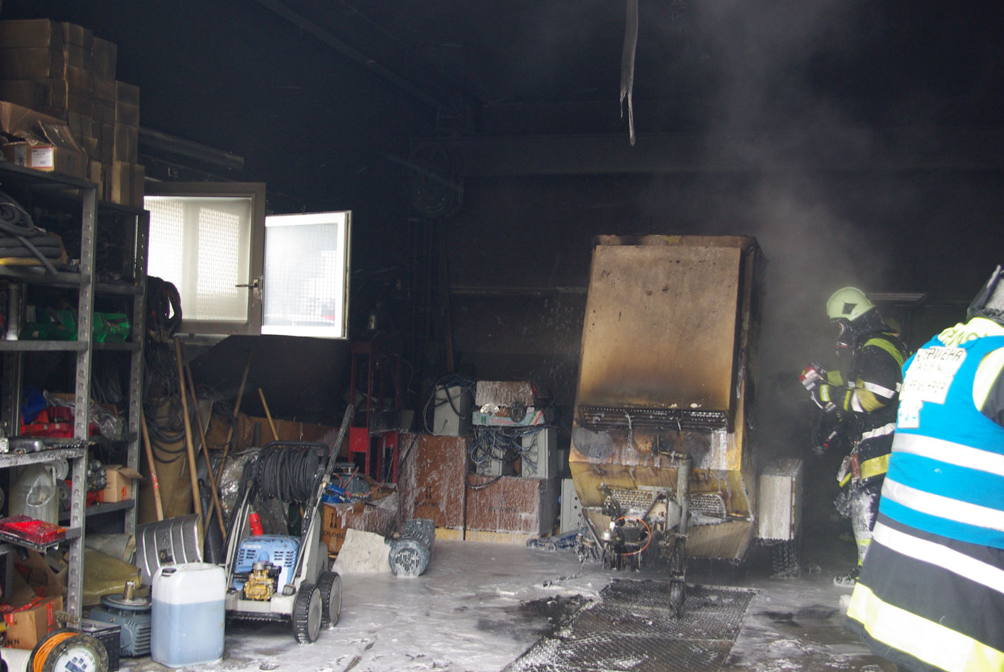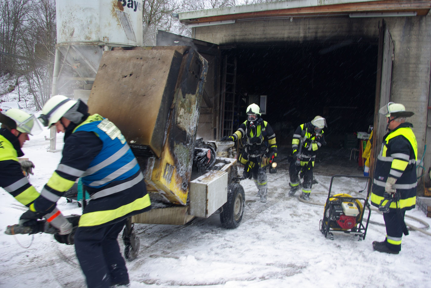 In einem kiesverarbeitendem Betrieb war, vermutlich durch vorhergehende Schweißarbeiten, an einem fahrbaren Stromaggregat Feuer ausgebrochen. Da sich der Stromerzeuger zum Zeitpunkt des Brandausbruchs in einem Anbau befand, wurden die dort gelagerten Teile und Einrichtungsgegenstände durch das Feuer beschädigt oder zerstört.