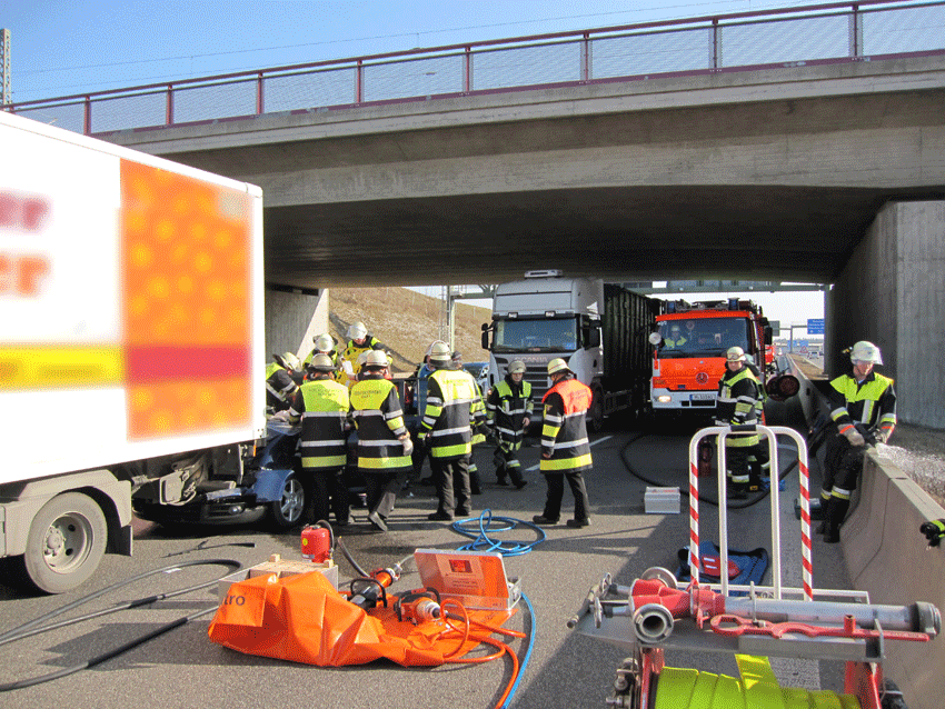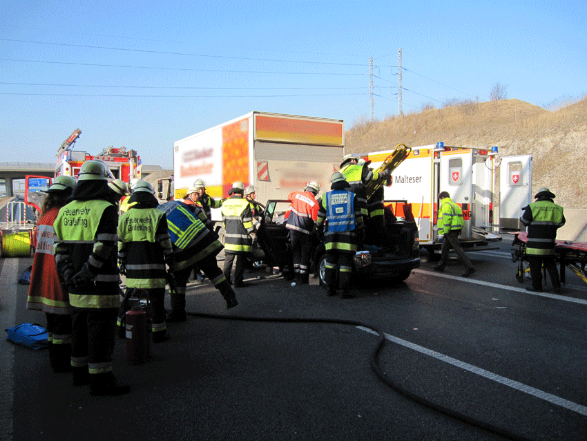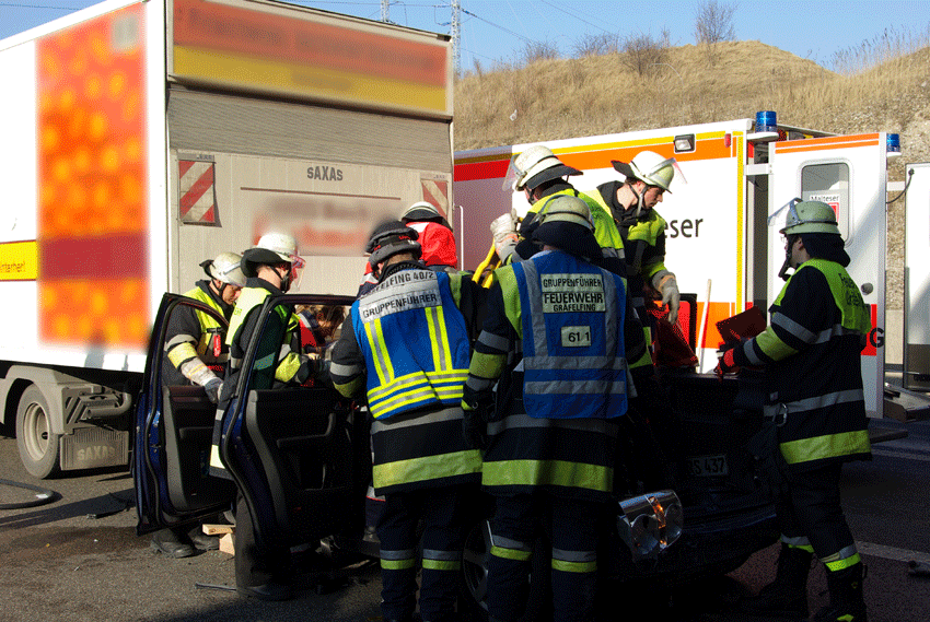 So mussten sich die alarmierten 30 Gräfelfinger Feuerwehrdienstleistenden aufteilen: Sechs Fahrzeuge fuhren auf die Autobahn zum Verkehrsunfall - zwei weitere in die Straße "Im Birket" zur Wohnungsöffnung. Während bei der Wohnungsöffnung kein Eingreifen durch die Feuerwehr erforderlich war, galt es auf der Autobahn Rettungsmaßnahmen durchzuführen.Bei dem Verkehrsunfall, in den zwei LKW und ein PKW verwickelt waren, musste der Fahrer des PKW durch die Feuerwehr mit Spreizer und Schere aus seinem PKW befreit werden. Durch die Feuerwehr Gräfelfing wurde zusätzlich der Brandschutz sichergestellt, in Zusammenarbeit mit der Polizei die Verkehrsabsicherung übernommen und auslaufende Betriebsstoffe aufgenommen. Der Einsatz dauerte insgesamt über zwei Stunden.
