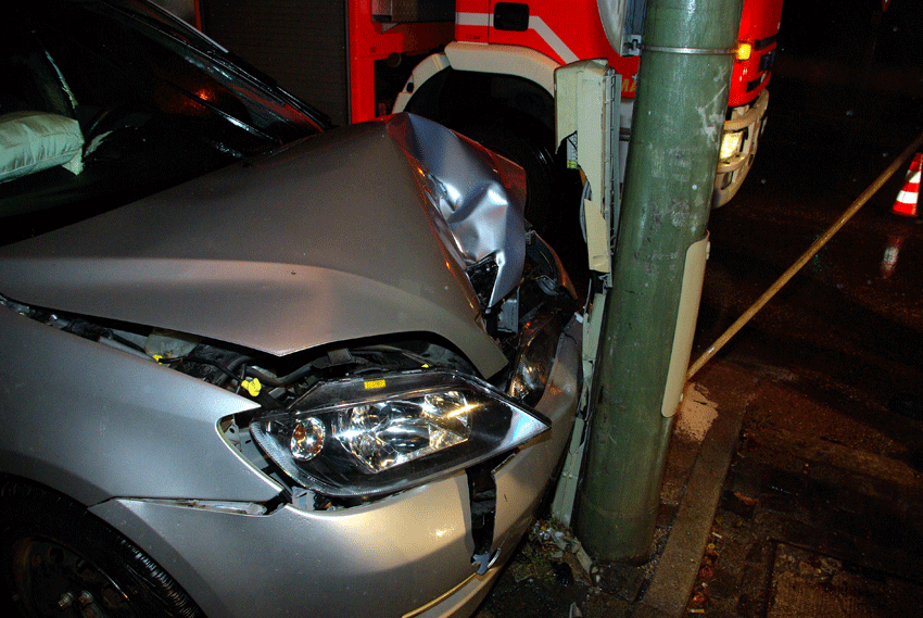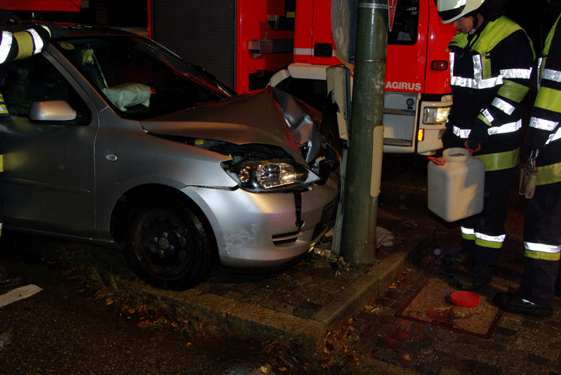 Die Fahrerin eines silbernen Mazdas hatte aus unbekannter Ursache eine Laterne an der Kreuzung Würmtalstraße und Bahnhofstraße frontal gerammt. Die verletzte Fahrerin des PKWs wurde zur genaueren Untersuchung vom Rettungsdienst in ein Krankenhaus gebracht. Beim Aufprall des PKWs lösten sich die Lampen der Laterne aus ihr Befestigung und baumelten nur noch an ihrer Verkabelung hängend über der Unfallstelle. Die Feuerwehr sicherte die Unfallstelle ab, stellte den Brandschutz sicher und nahm die auslaufenden Betriebsstoffe des Fahrzeugs auf. Zusätzlich mussten von der Feuerwehr mit der Drehleiter die absturzgefährdeten Teile der Laterne entfernt werden.