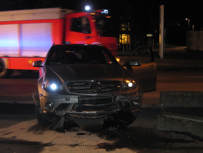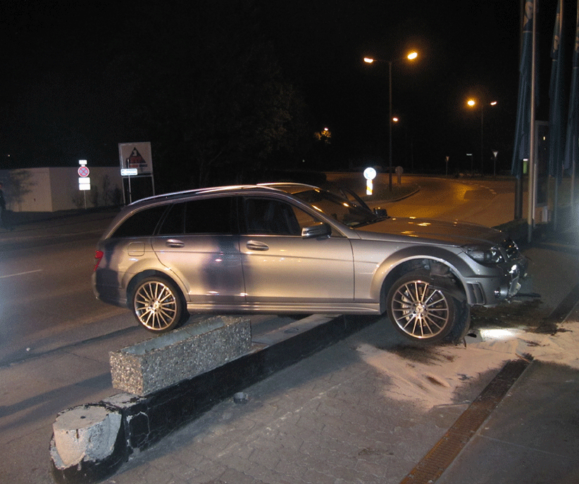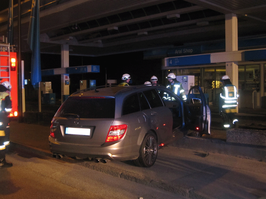 Ein Mercedes AMG war von der Fahrbahn abgekommen, über den Gehweg gefahren und dann auf einer etwa kniehohen Mauer, welche eine Tankstelle von der Straße trennt, zum Stehen gekommen. Bei dem Unfall wurde zum Glück niemand verletzt. Lediglich das Fahrzeug und zwei Blumenkästen die einst auf der Mauer standen wiesen deutliche Unfallspuren auf. Die Feuerwehr nahm das ausgelaufene Motoröl mittels Ölbindemittel auf und säuberte die Tankstelle von den Trümmerteilen. Das Unfallfahrzeug wurde vom Abschleppdienst von der Mauer gehoben und in eine Werkstatt verbracht.