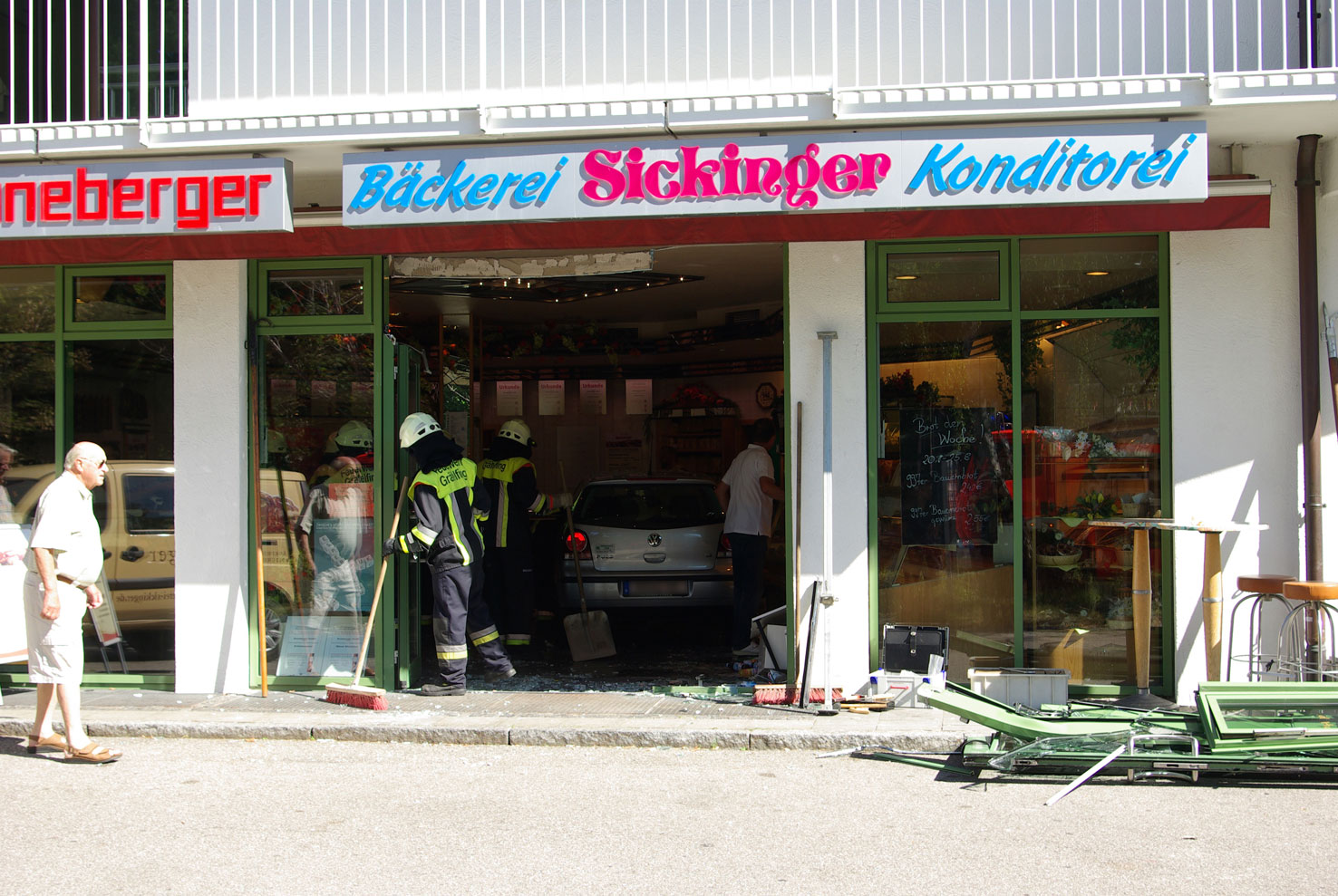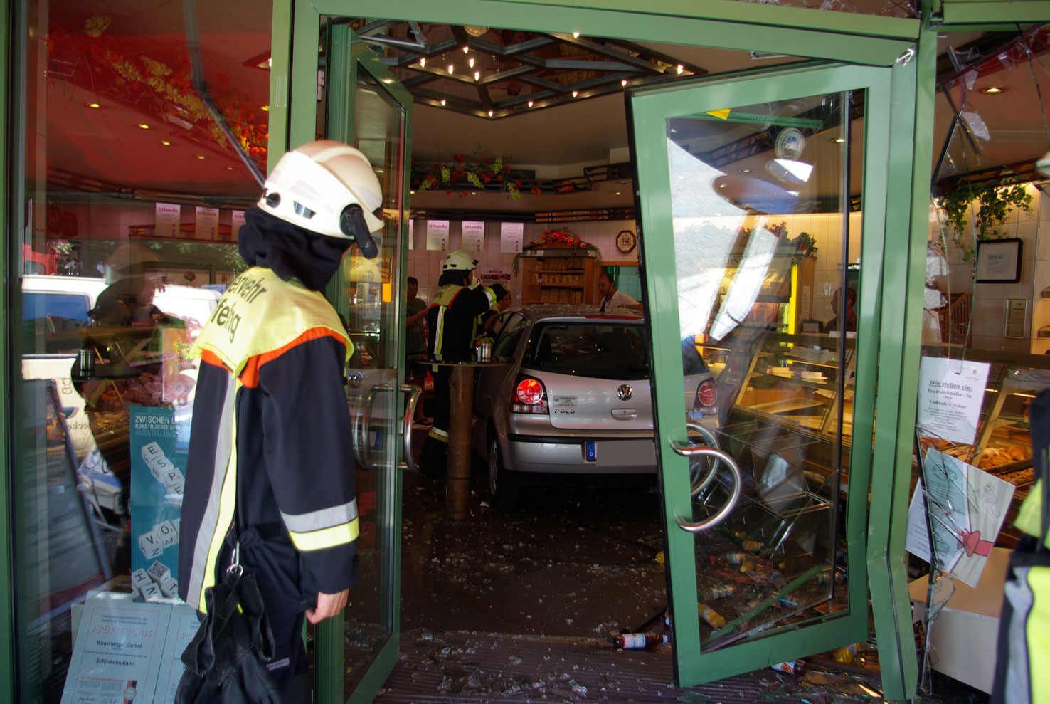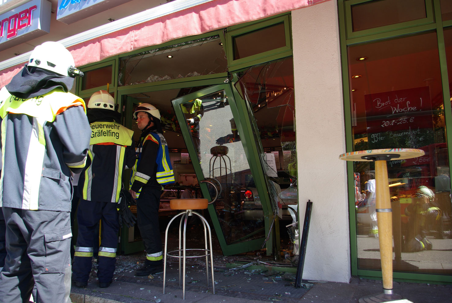 Die Fahrerin eines VW Polos war mit ihrem Fahrzeug durch die Eingangstüre eines Ladengeschäfts gefahren und erst an den Theken, der im Erdgeschoss befindlichen Bäckerei und Metzgerei, zum Stehen gekommen. Bei dem Unfall wurden insgesamt zwei Personen verletzt und mussten vom Rettungsdienst behandelt werden. Die Feuerwehr Gräfelfing entfernte die einsturzgefährdeten Türelemente und brachte den PKW ins Freie.