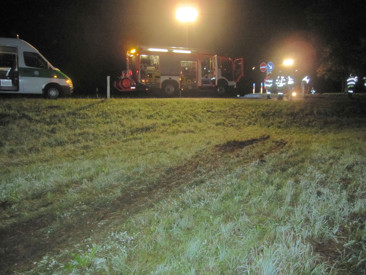 Nachdem er von seiner Fahrspur abgekommen und über einen angrenzenden Grünstreifen und die Gegenspur gerutscht war, flog er mit seinem Fahrzeug in eine knapp zwei Meter tieferliegenden Wiese in der er nach ca. 25 Metern zum Stehen kam. Nach seinem spektakulären Abflug setzte der Fahrer die Flucht vor der Polizei zu Fuß fort. Die Feuerwehr Gräfelfing leuchtete für die Polizei die Unfallstelle aus und zog mit einer Seilwinde das verunfallte Fahrzeug aus der Wiese. Während der Unfallaufnahme durch die Polizei und für die anschließenden Fahrbahnreinigungsarbeiten musste die Autobahnausfahrt Gräfelfing von der Feuerwehr für ca. 1 Stunde gesperrt werden.