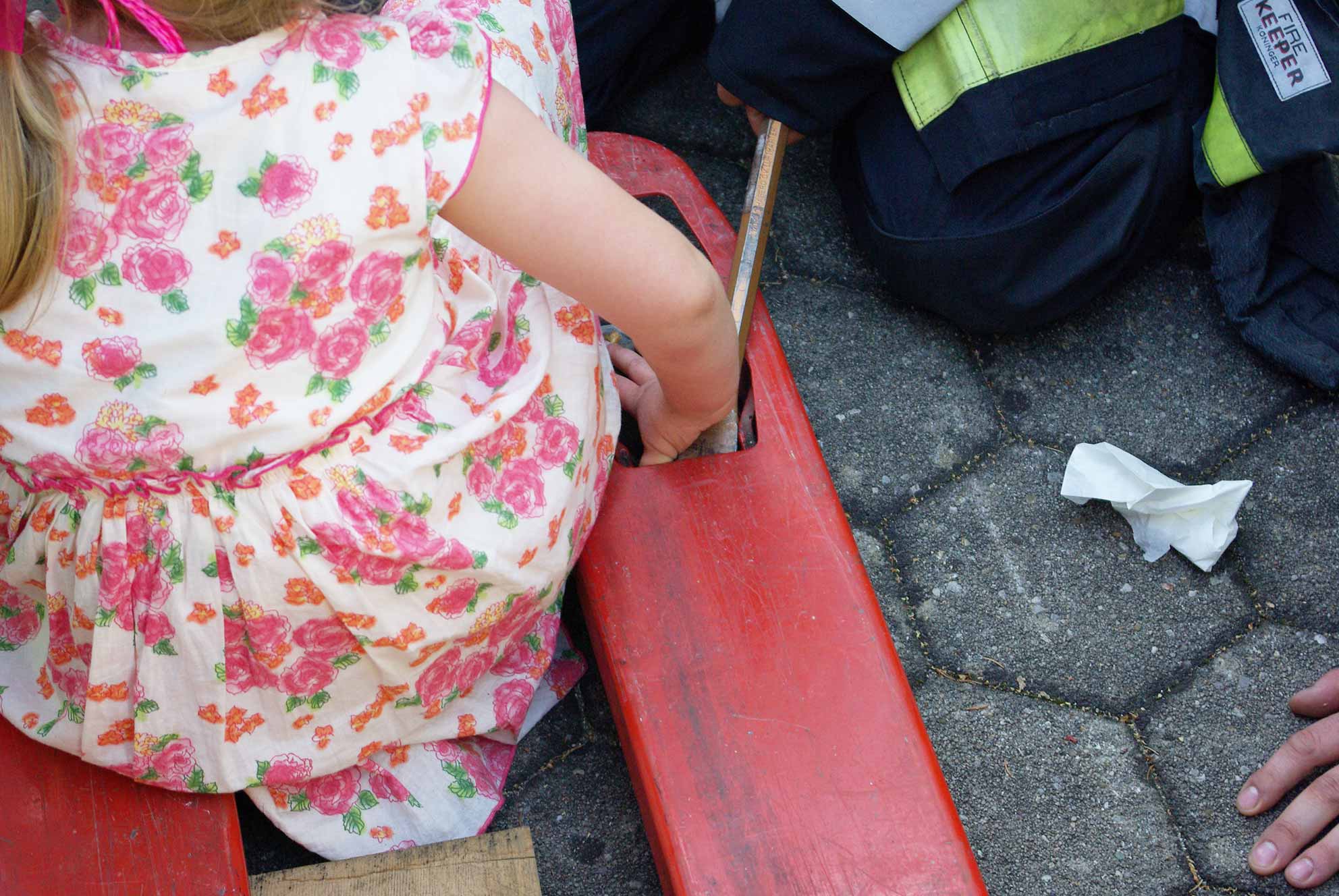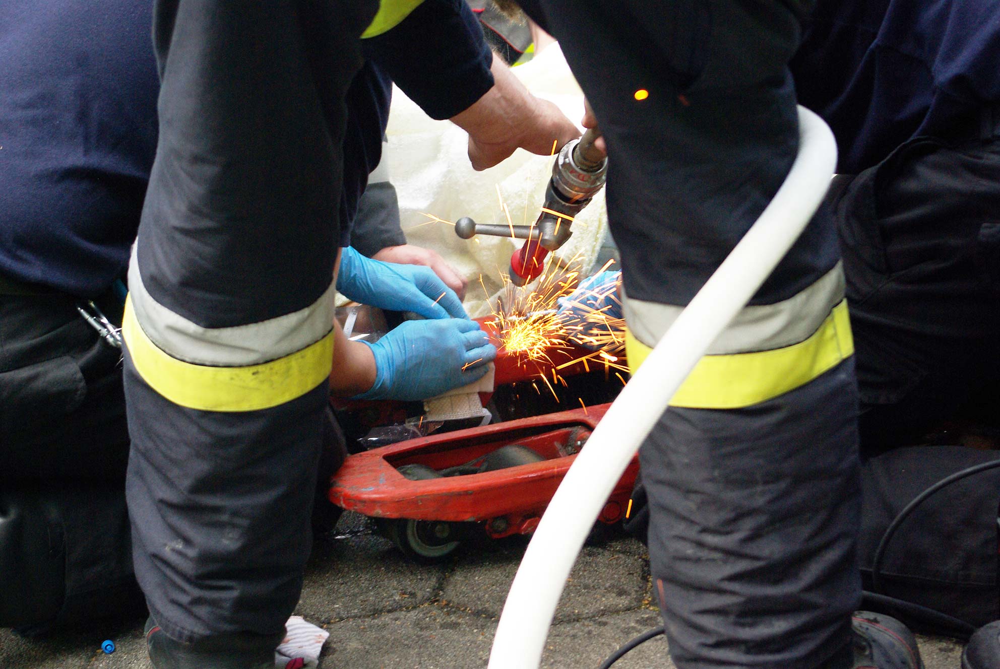 Das 6 Jahre alte Mädchen geriet beim Spielen mit der Hand zwischen Hubgabelarm und Laufrolle eines Hubwagens und klemmte sich dabei den Daumen im Gerät ein. Bei Ankunft der Feuerwehr wurde das Kind bereits vom Rettungsdienst versorgt, eine rasche Befreiung mit gängigen Feuerwehrwerkzeugen war jedoch nicht möglich. Die vorsorglich hinzualarmierte Berufsfeuerwehr München brachte ein spezielles Feinmechanikerwerkzeug an die Einsatzstelle, mit dessen Hilfe der eingeklemmte Daumen schonend aus seiner Zwangslage befreit werden konnte. Aufgrund der komplizierten Verhältnisse dauerte die patientenschonende Rettung ca. eine Stunde. Das Kind wurde vom Rettungsdienst zur Behandlung ins Krankenhaus gebracht, über den genauen Schweregrad der Fingerverletzung können seitens der Feuerwehr keine Angaben gemacht werden.