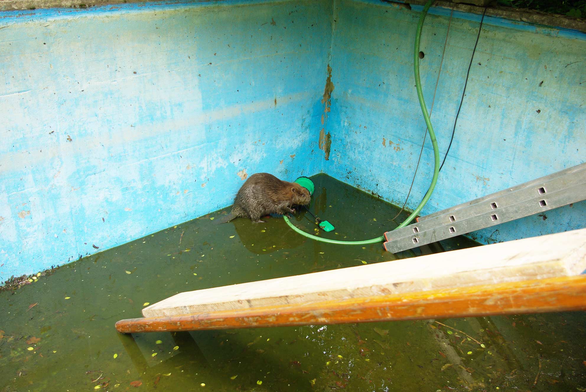 Seine Schwimmkünste wollte ein Biber wohl den Bewohnern eines Anwesens in der Planegger Straße am 24.05.2014 demonstrieren. Zum Ärger des Bibers war der Wasserstand im Pool des Anwesens dafür jedoch nicht ausreichend hoch, sodass er nun im Becken saß und nicht mehr heraus kam. Die alarmierte Feuerwehr baute dem Biber mit einer hölzernen Klappleiter und ein paar Bohlen eine Fluchtmöglichkeit.