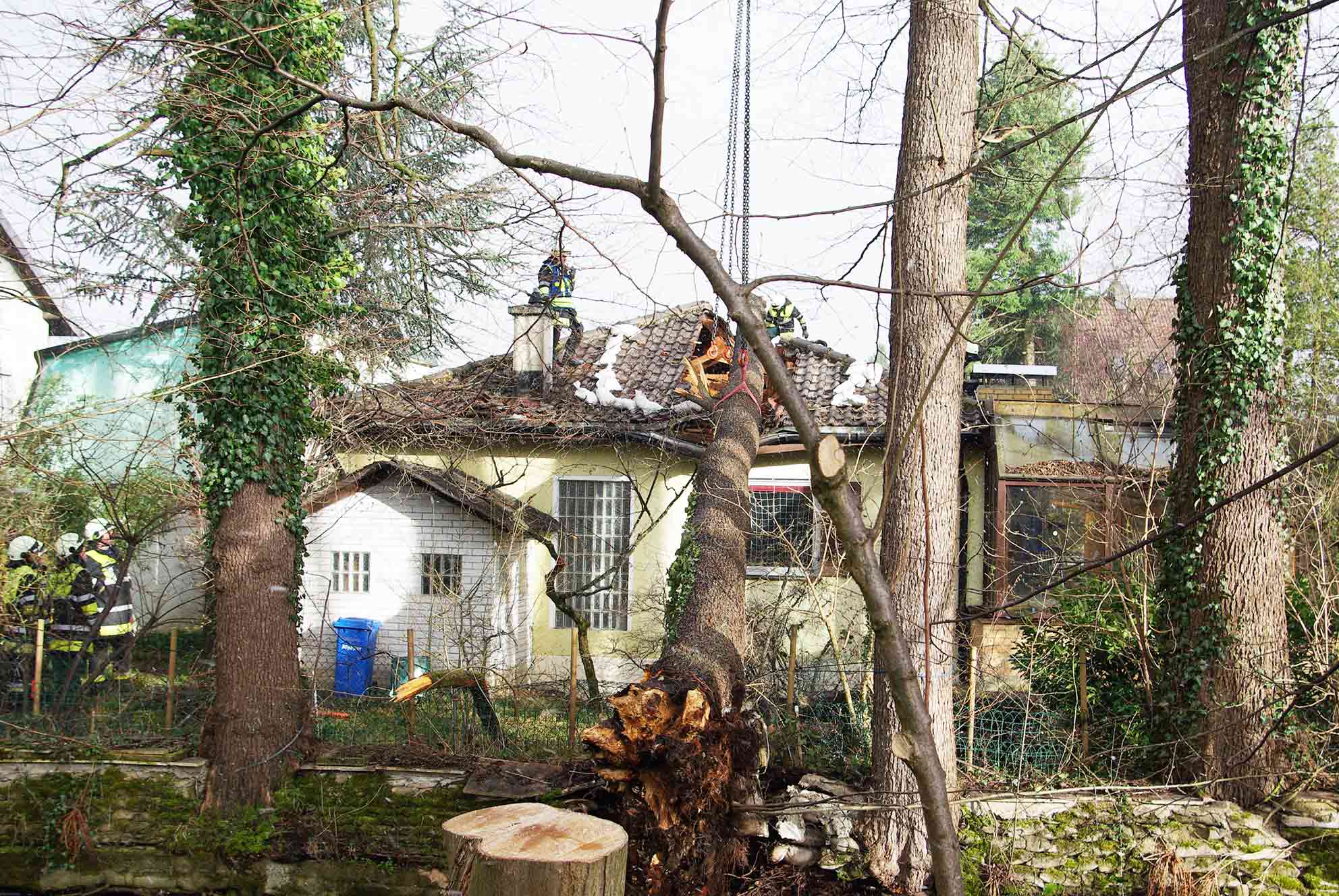 Im Laufe des Nachmittags trafen erste Feuerwehrkameraden, die eigentlich an der Fahrzeugübergabe in Linz teilnehmen wollten, am Gerätehaus ein und unterstützten an den verschiedenen Einsatzstellen. Dabei galt es auch weiterhin mit Motorsägen Bäume von Straßen und Hausdächern zu entfernen. Mitunter war dabei die Lage so riskant, dass sogar mehrfach ein Autokran zur Beseitigung angefordert werden musste.