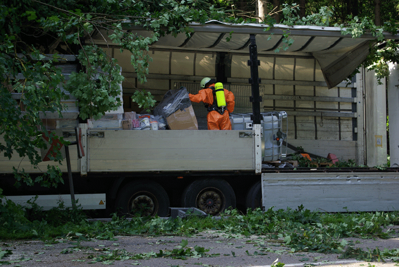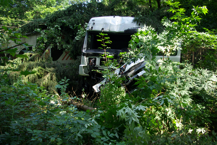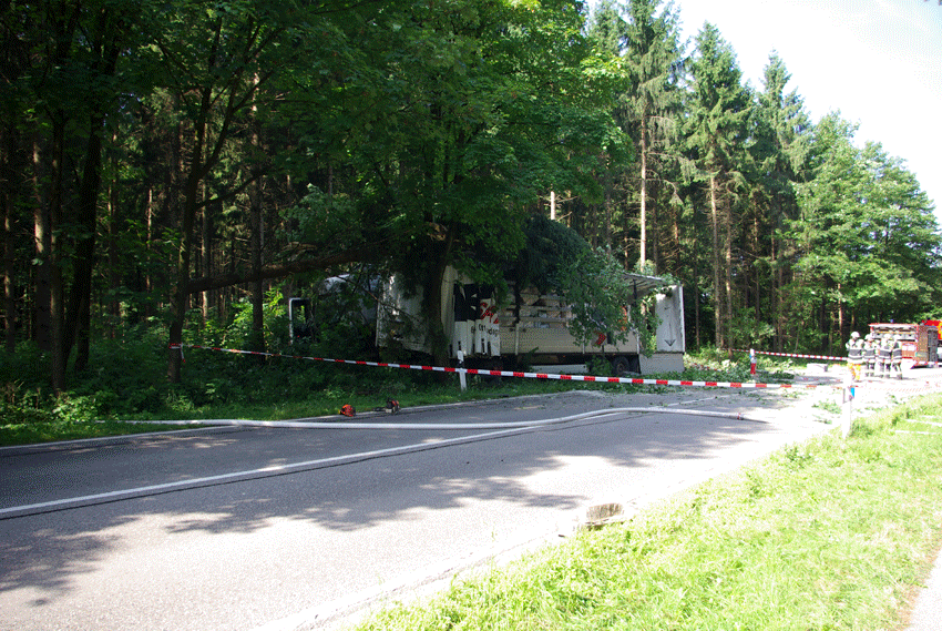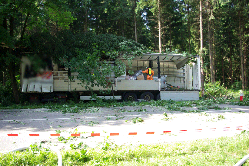Aus unbekannter Ursache war ein die M21 in östlicher Richtung befahrender Sattelzug von der Fahrbahn abgekommen und in den angrenzenden Hochwald gefahren. Nachdem er einige Bäume umgerissen hatte, kam er parallel zur Straße im Wald zum Stehen. Der verletzte Fahrer musste vom Rettungsdienst versorgt werden. Der LKW hatte Stückgut geladen: einen Intermediate Bulk Container gefüllt mit Batteriesäure. Zudem war der Dieseltank des LKW durch den Aufprall beschädigt worden. Die Feuerwehr stellte den Brandschutz sicher und fing die auslaufenden Flüssigkeiten auf, bevor diese im Erdreich größeren Schaden anrichten konnten.