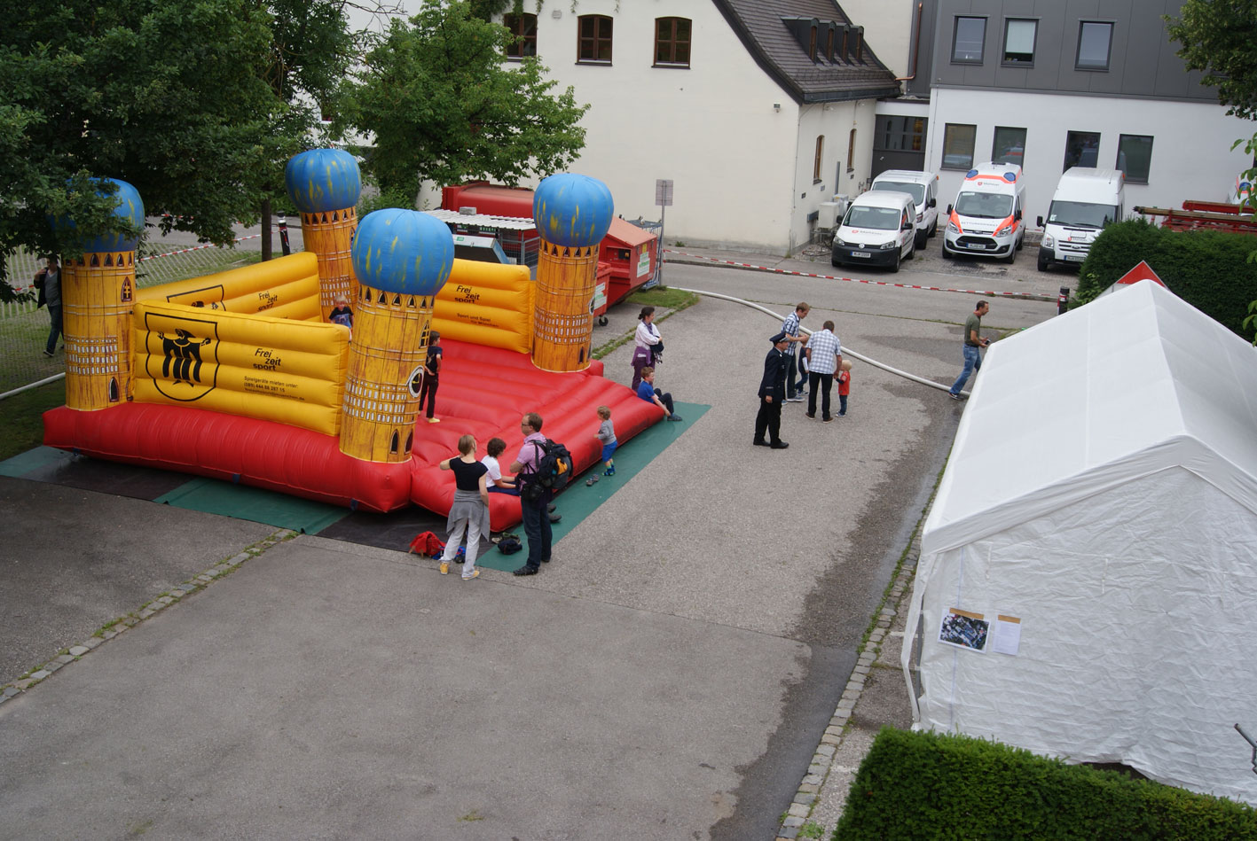 Die Kinder konnten an einer Spritzwand das Löschen ausprobieren oder auch mit dem Dachwerfer unseres TLF's spritzen. Eine große Hüpfburg mit dem Motiv eines Feuerwehrautos war aufgebaut, die Kinder konnten sich schminken lassen und ein Eis gab es, wenn man die Aufgaben für den Feuerwehrpass geschafft hat.