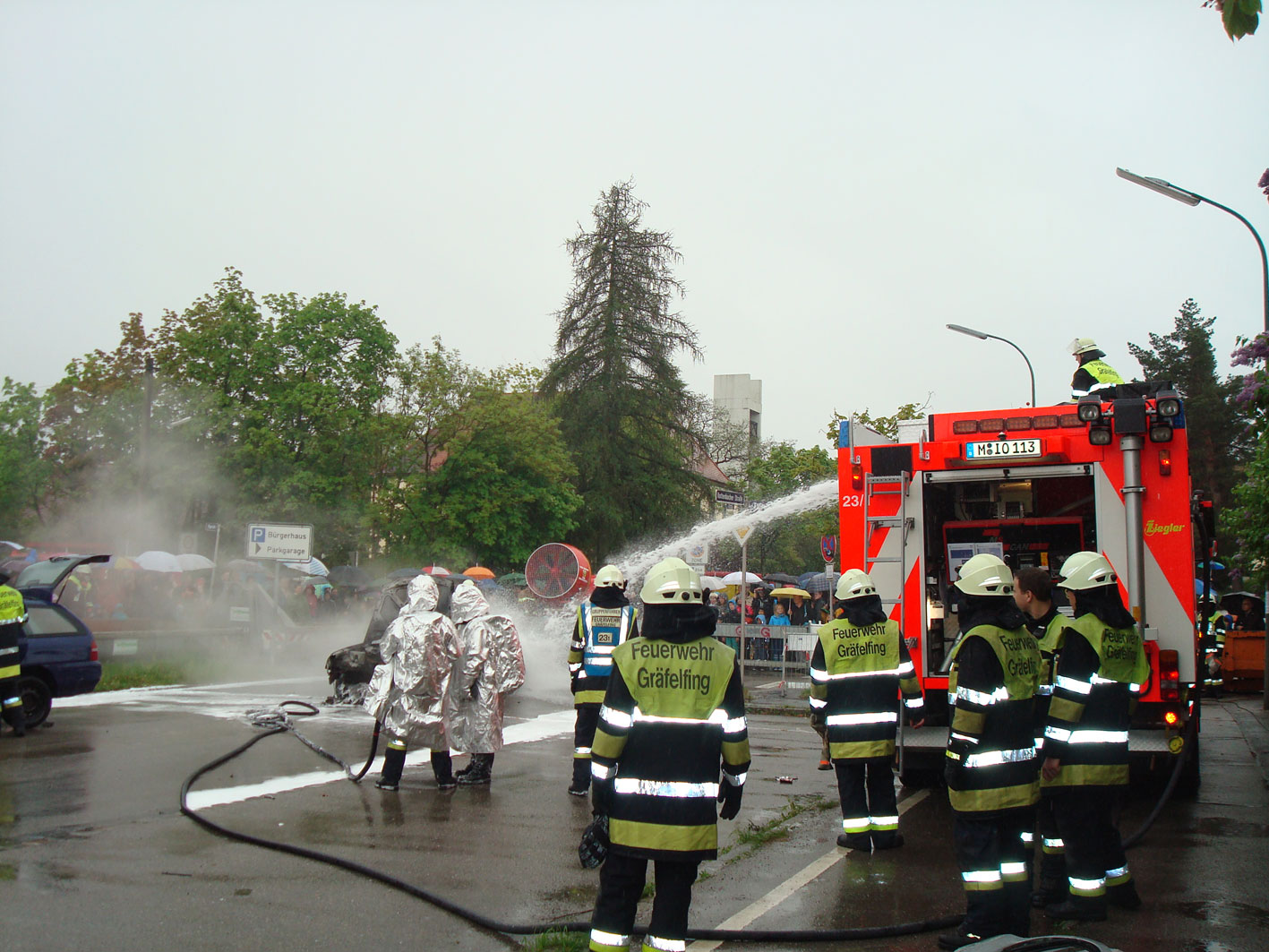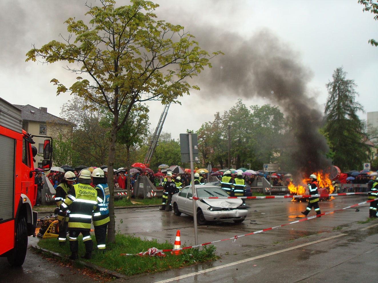 Anlässlich der 1250 Jahr-Feier unserer Gemeinde präsentierten wir am 11.5.13 der Gräfelfinger Bevölkerung eine ganz besondere Showübung in der Rottenbucherstraße. Unterstützt von einem Stuntteam wurde ein Verkehrsunfall mit einem ferngelenkten PKW nachgestellt. Vor einem breiten Publikum zeigte die Feuerwehr und der MHD ihr ganzes Können und präsentierte all die technischen Möglichkeiten.