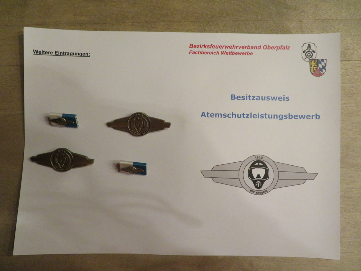 Bei der ersten Station wird das korrekte und vollständige Anlegen des Atemschutzgeräts, wie auch die Aufnahme der Zusatzausrüstung durch die strengen Augen der Prüfer überwacht. An der Station Nummer 2 wird die Rettung einer Person mittels Bergetuch und Leinensicherung auf Zeit abgeprüft. Bei der dritten Station war es die Aufgabe einen angenommen Zimmerbrand im zweiten Obergeschoss auch auf Zeit zu „löschen“. Bei Station 4 konnten wir alle an uns gestellten Fragen zum Atemschutzgerät richtig beantworten. Ebenfalls wurde von uns ein Flaschenwechsel am Atemschutzgerät vorgenommen, um das Gerät wieder einsatzklar zu machen. Als Abschluss mussten wir an der letzten Station unsere theoretischen Kenntnisse in einem schriftlichen Test nachweisen. Die Verleihung der Urkunde und des Abzeichens fand im Übungshof der Feuerwehr Hemau statt. Aus der Hand von Karl Diepold, dem Landeswettbewerbsleiter im Landesfeuerwehrverband Bayern, erhielten wir unser neues Abzeichen. Als Resümee können wir feststellen, dass wir nicht nur ein neues Abzeichen erhalten haben, sondern auch unser vorhandenes Wissen vertieft und verfeinert haben.