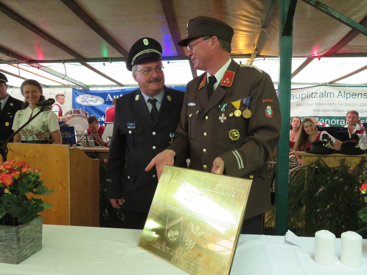 30 Jahre Partnerschaft mit den Kameraden der FF Zauchen und 120-jähriges Bestehen der FF Zauchen waren Gründe genug, um mit einer großen Abordnung und unserer 1. Bürgermeisterin Frau Uta Wüst zum diesjährigen Waldfest nach Zauchen (Bad Mitterndorf) zu fahren. Bereits am Freitag Abend gab es in der Pfannerhütte im Ski- und Wandergebiet Tauplitzalm einen geselligen Kameradschaftsabend mit Grillbuffet. Anlässlich der 30 gemeinsamen Jahre gab es von uns für die Zauchner Feuerwehr ein Fotobuch, indem die verschiedenen Zusammenkünfte von den Anfängen bis zum jetzigen Zeitpunkt festgehalten sind. Am Samstag besuchten wir das Waldfest und am Sonntag Vormittag wurde ein Feldgottesdienst am Festplatz zu Ehren der Zauchner Kameraden und ihrem 120-jährigen Gründungsfest abgehalten. Ebenfalls wurde die 30-jährige Partnerschaft noch einmal hervorgehoben. Zur Erinnerung und als Zeichen der Verbundenheit gab es von uns eine Bronzetafel als Geschenk.