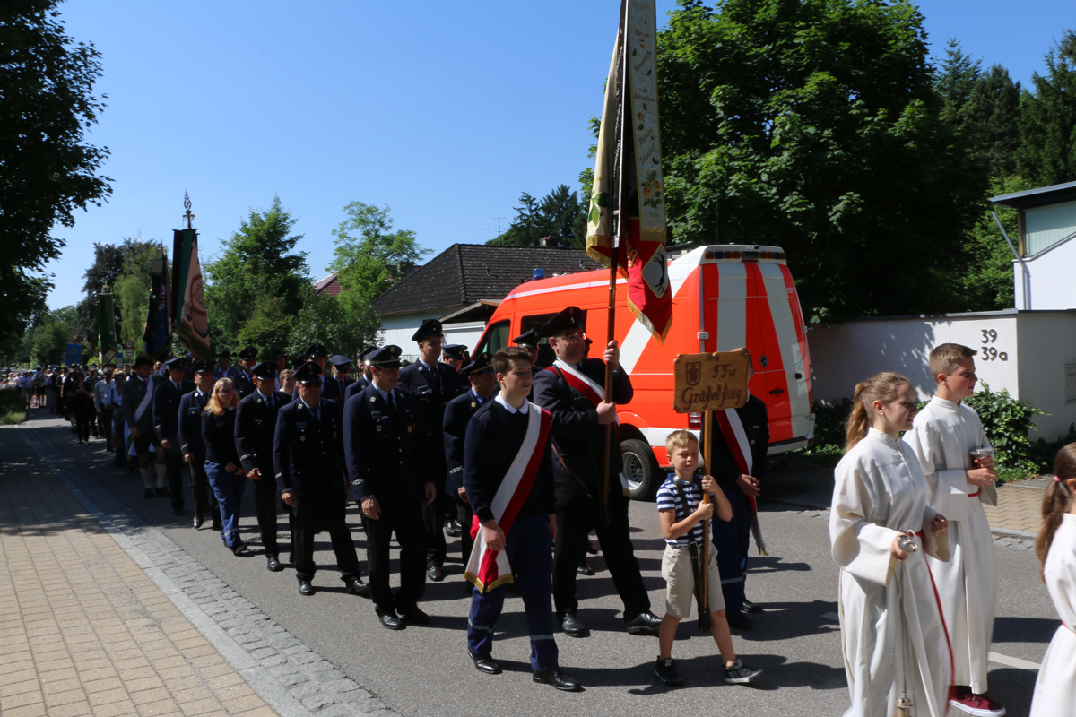 Dieses Jahr fand von unserem Pfarrverband die Fronleichnamsprozession nur in der Kirche St. Johannes Evangelist in Lochham statt, bei der wir mit einer Abordnung teilnahmen. Die Prozession führte über die Aubingerstraße und am Vogelherd zum Rudolf-vom-Hirsch-Platz. Dann zog man über die Waldheim- und Sämanstraße zum Wegkreuz in der Gabriel von Seidl Straße. Nach dieser Station zogen die Gläubigen wieder zurück in die Kirche in der Leiblstraße. Der Fronleichnamszug wurde durch die Feuerwehr abgesichert.