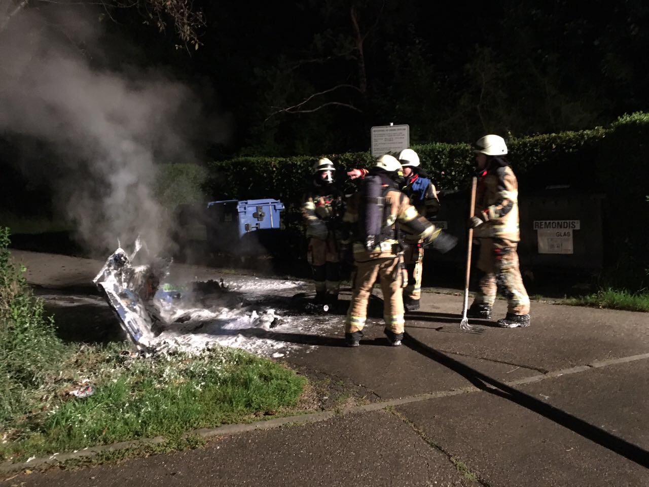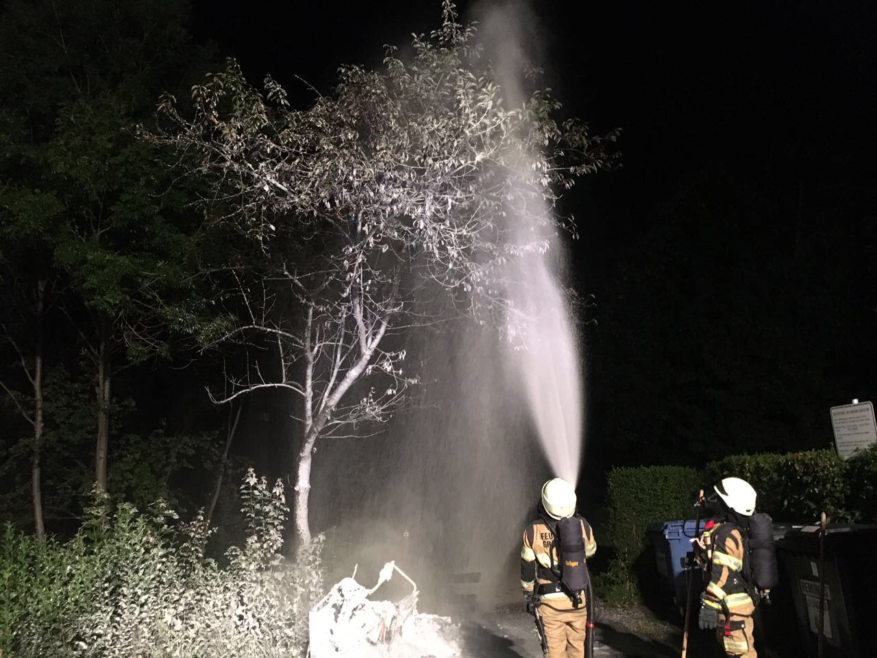 In der Nacht von Freitag auf Samstag, den 26. August wurde die FF Gräfelfing um 03:10 Uhr zum Brand eines Containers am Wasserbogen gerufen. Beim Eintreffen stand der Papiercontainer bereits in Vollbrand. Ein Trupp unter schwerem Atemschutz löschte das Feuer, durchsuchte mit Dunggabeln das verbliebene brennbare Material und kontrollierte mit einer Wärmebildkamera die gesamte Brandstelle. Auch ein durch die starke Wärmeentwickung in Mitleidenschaft gezogener Baum, wurde vorsorglich abgelöscht.