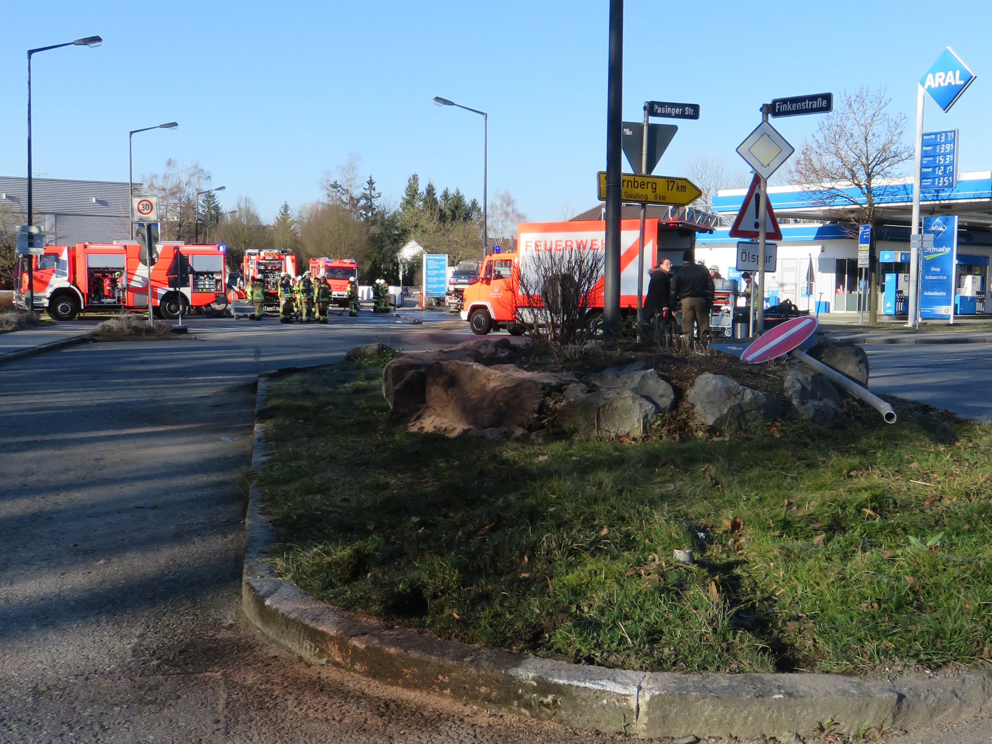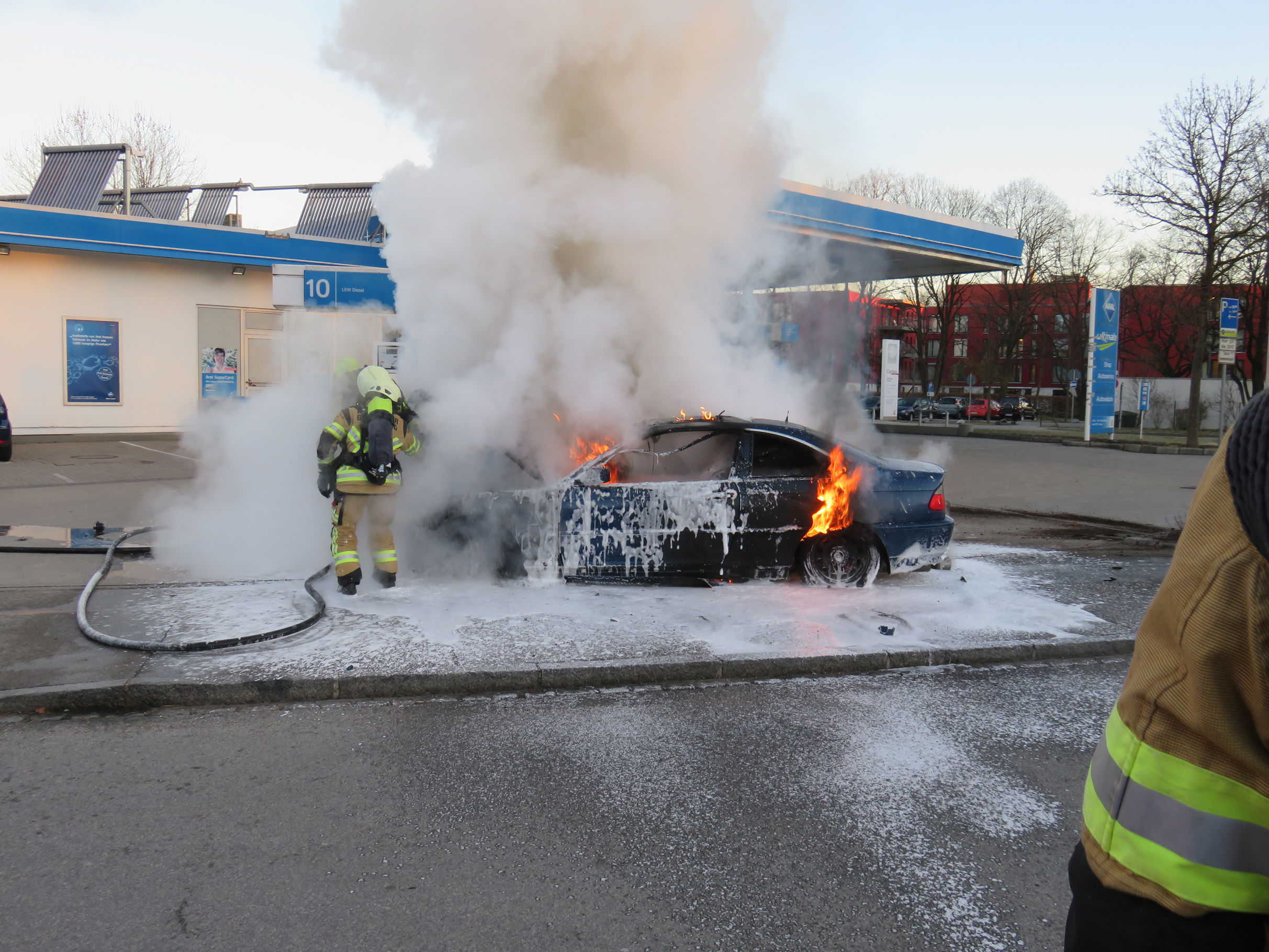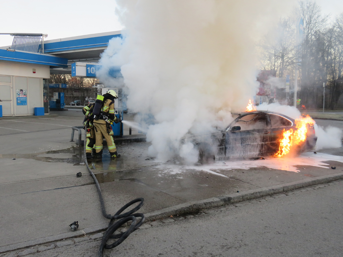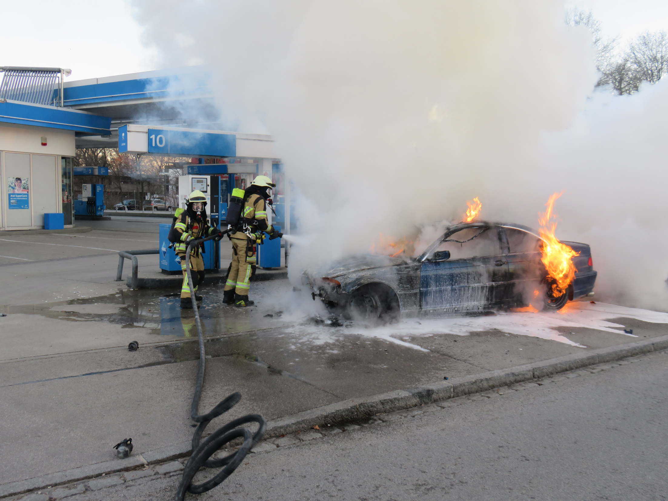 Beim Eintreffen befand sich ein PKW in der Nähe einer Zapfsäule im Vollbrand. Laut Auskunft der Polizei hatte der stark alkoholisierte Fahrer des 3er-BMW in der Pasinger Straße die Kontrolle über sein Fahrzeug verloren, eine Verkehrsinsel touchiert und war dann unmittelbar vor der Tankstelle mit seinem beschädigten Fahrzeug zum Stehen gekommen. Kurz nachdem er sein Fahrzeug unverletzt verlassen hatte, entzündete sich vermutlich auslaufender Kraftstoff an den heißen Fahrzeugteilen und setzte das Fahrzeug in Brand.