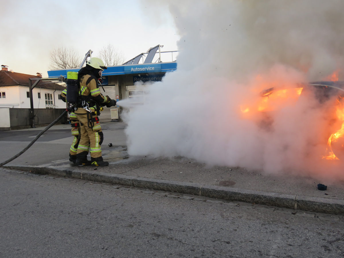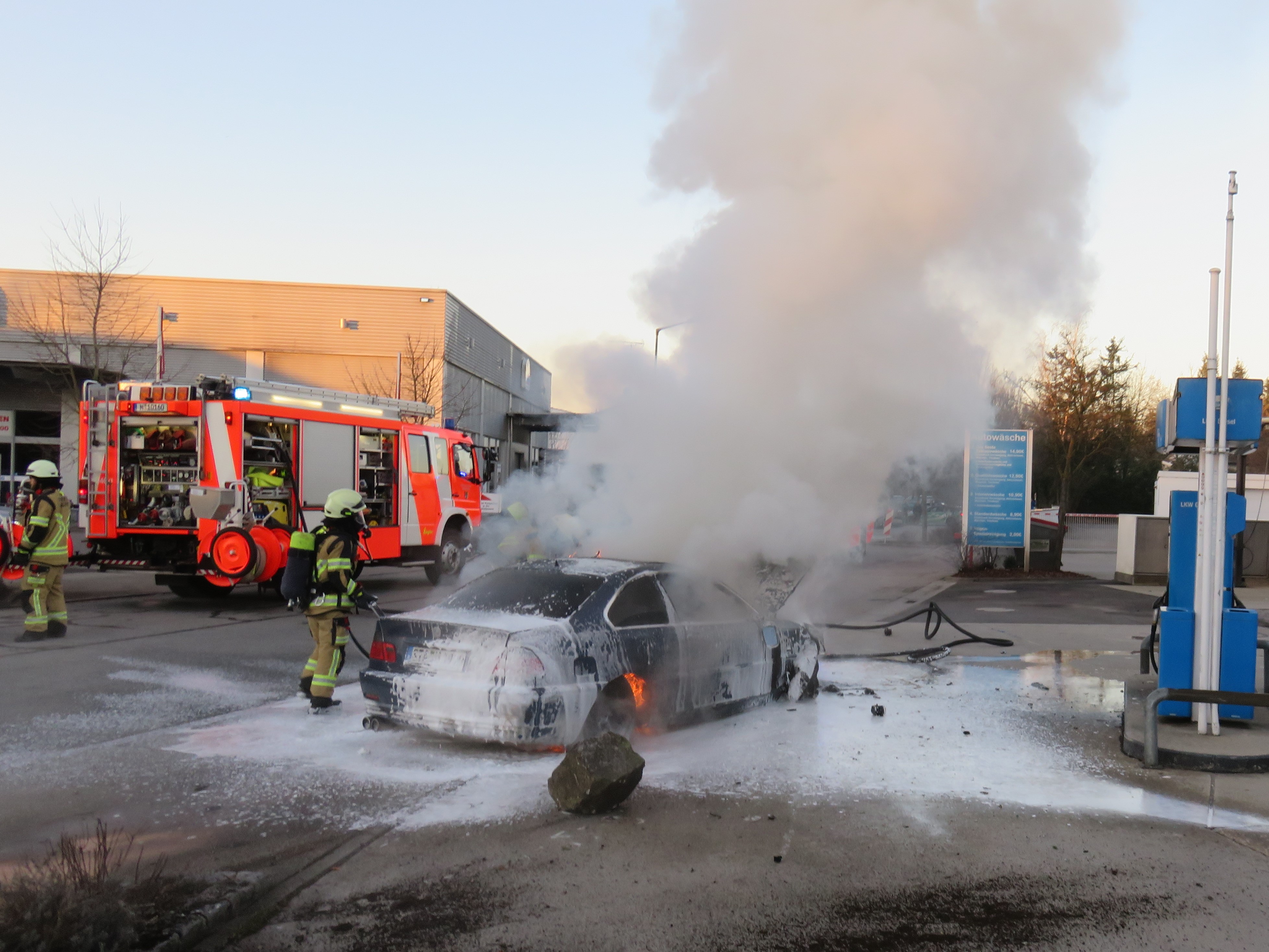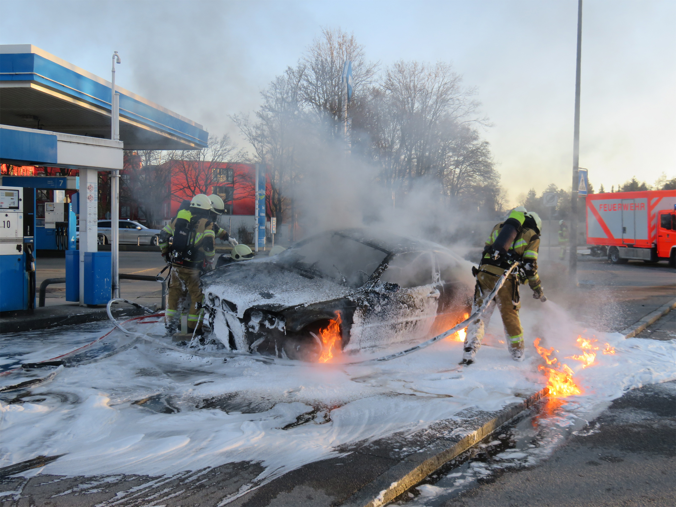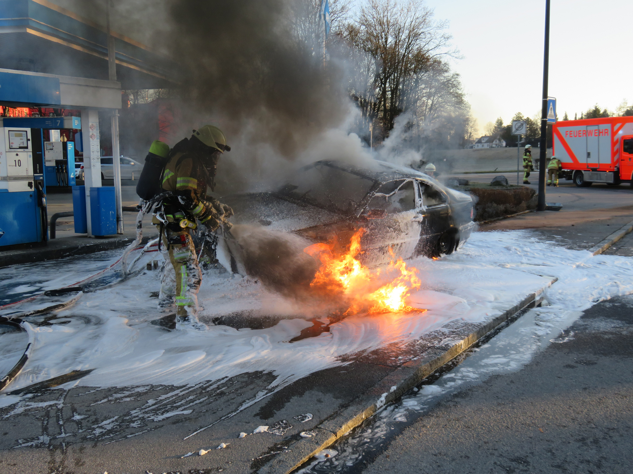 Beim Eintreffen befand sich ein PKW in der Nähe einer Zapfsäule im Vollbrand. Laut Auskunft der Polizei hatte der stark alkoholisierte Fahrer des 3er-BMW in der Pasinger Straße die Kontrolle über sein Fahrzeug verloren, eine Verkehrsinsel touchiert und war dann unmittelbar vor der Tankstelle mit seinem beschädigten Fahrzeug zum Stehen gekommen. Kurz nachdem er sein Fahrzeug unverletzt verlassen hatte, entzündete sich vermutlich auslaufender Kraftstoff an den heißen Fahrzeugteilen und setzte das Fahrzeug in Brand.