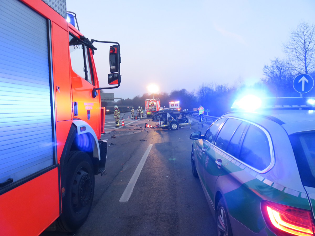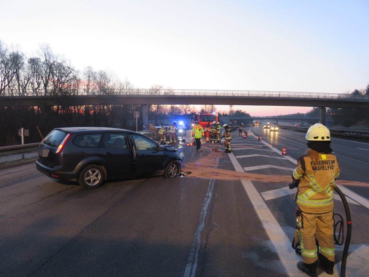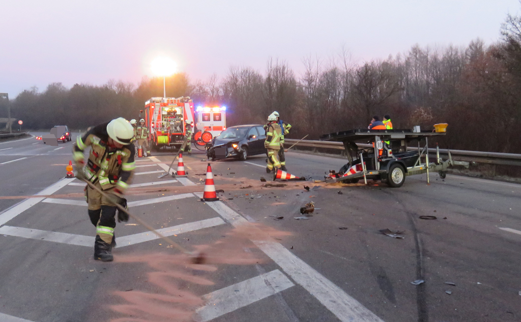 Am frühen Sonntagmorgen gegen 6:30 Uhr wurden erneut 16 Kameraden aus dem Schlaf gerissen. Ein 20-jähriger PKW-Fahrer war auf Höhe der Anschlussstelle auf der A96 Richtung Lindau mit einem Verkehrsabsicherungsanhänger der Autobahnmeisterei kollidiert. Dabei wurde der Lenker glücklicherweise nur leicht verletzt, allerdings entstand an beiden Fahrzeugen ein Totalschaden. Seitens der Gräfelfinger Feuerwehr wurde die Unfallstelle abgesichert, der Brandschutz sichergestellt sowie ausgelaufene Betriebsmittel gebunden. Nach rund einer Stunde konnten die Floriansjünger wieder in das Gerätehaus einrücken