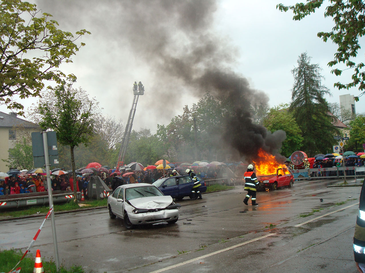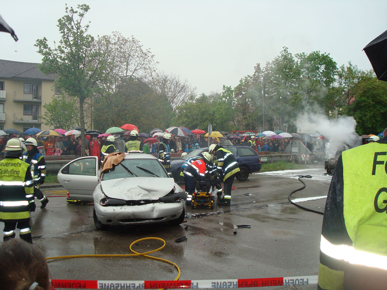 Anlässlich der 1250 Jahr-Feier unserer Gemeinde präsentierten wir am 11.5.13 der Gräfelfinger Bevölkerung eine ganz besondere Showübung in der Rottenbucherstraße. Unterstützt von einem Stuntteam wurde ein Verkehrsunfall mit einem ferngelenkten PKW nachgestellt. Vor einem breiten Publikum zeigte die Feuerwehr und der MHD ihr ganzes Können und präsentierte all die technischen Möglichkeiten.